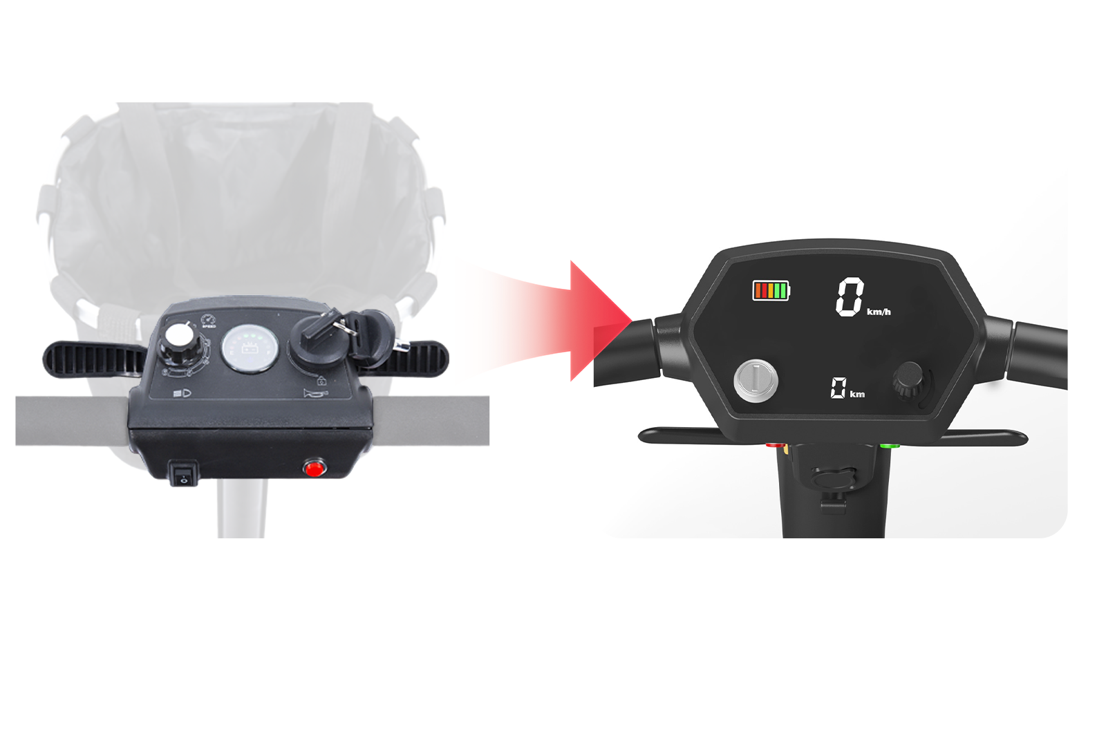 Níl an ceallraí analóg bunaidh agus táscairí luais éasca le húsáid d'úsáideoirí scothaosta a bhfuil droch-radharc na súl acu. Tá taispeáint dhigiteach LED ard-sainmhínithe** sa leagan uasghrádaithe, a thaispeánann go cruinn an luas reatha, an ceallraí atá fágtha, agus an modh tiomána i bhfíor-am. Tá an leibhéal ceallraí in iúl go soiléir ag trí dathanna: glas, buí, agus dearg, ag soláthar meabhrúchán amhairc a ghearradh nuair íseal. Tá an taispeáint luais cruinn go 0.1 km / h, agus leis an knob coigeartaithe luais (inchoigeartaithe ó 2 go 8 km / h), is féidir le húsáideoirí a rithim tiomána a rialú níos cruinne, ag seachaint míchompord na luaineachtaí luais.