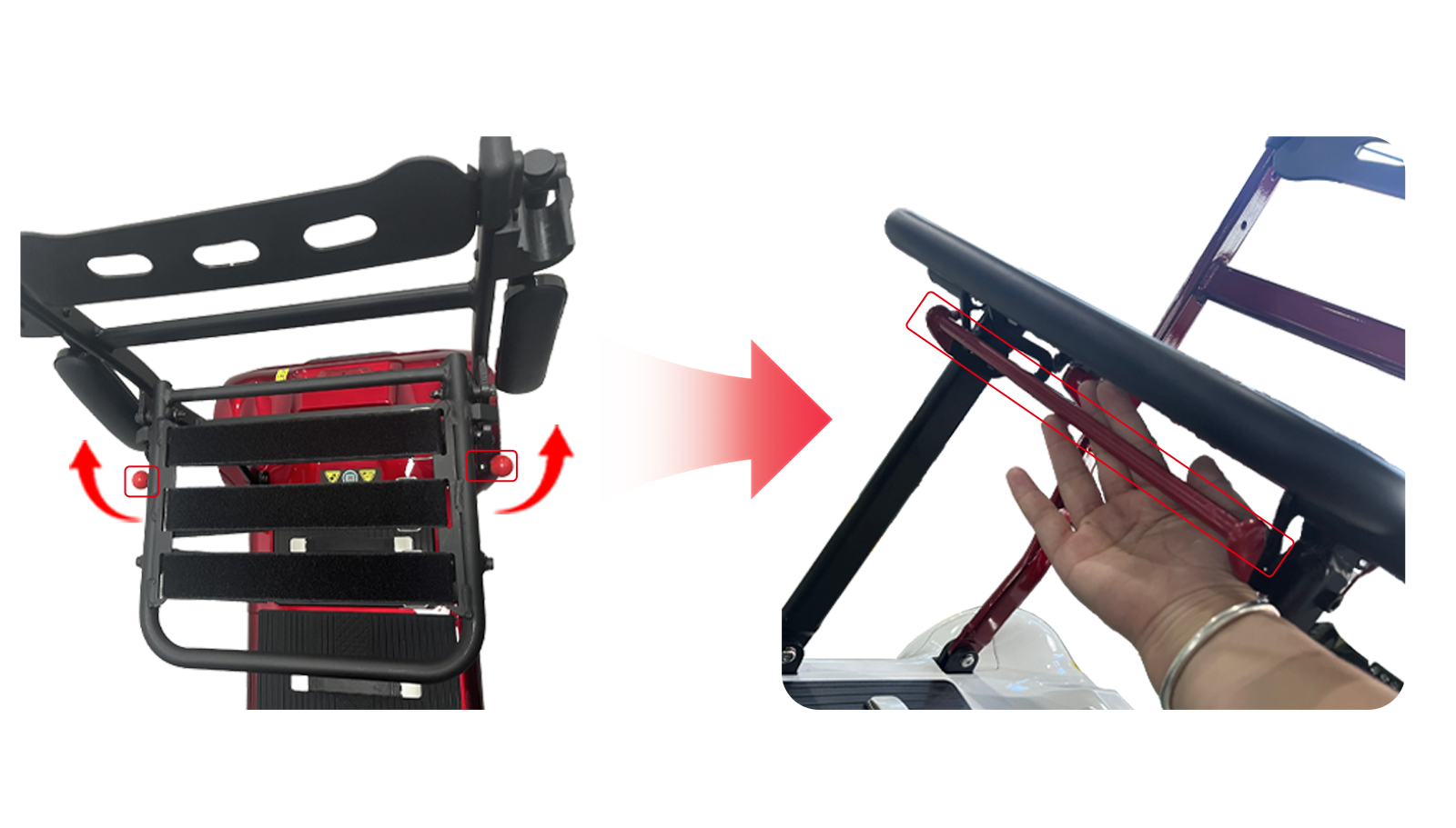 Is féidir le modh fillte dhá-láimhe an bhunleagan a bheith deacair d'úsáideoirí a bhfuil neart teoranta nó lámh amháin acu. Tá meicníocht nuálaíoch “aon-dteagmháil, aonláimhe fillte”** sa leagan uasghrádaithe. Níl ort ach depressing an latch fillte suíocháin le lámh amháin folds an fráma agus suíochán ag an am céanna i 10 soicind. Mar gheall ar dhlúthmhéid fillte, bíonn sé níos éasca do dhaoine scothaosta atá ina gcónaí leo féin pacáil a dhéanamh nó do bhaill teaghlaigh stuáil isteach i stoc cairr, ag baint amach “stóráil éadrom le haghaidh taistil áisiúil”.